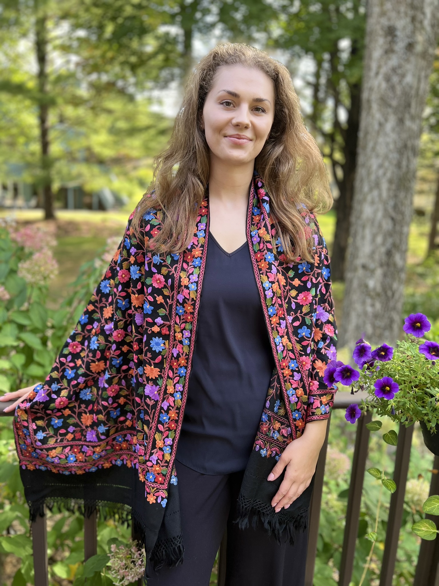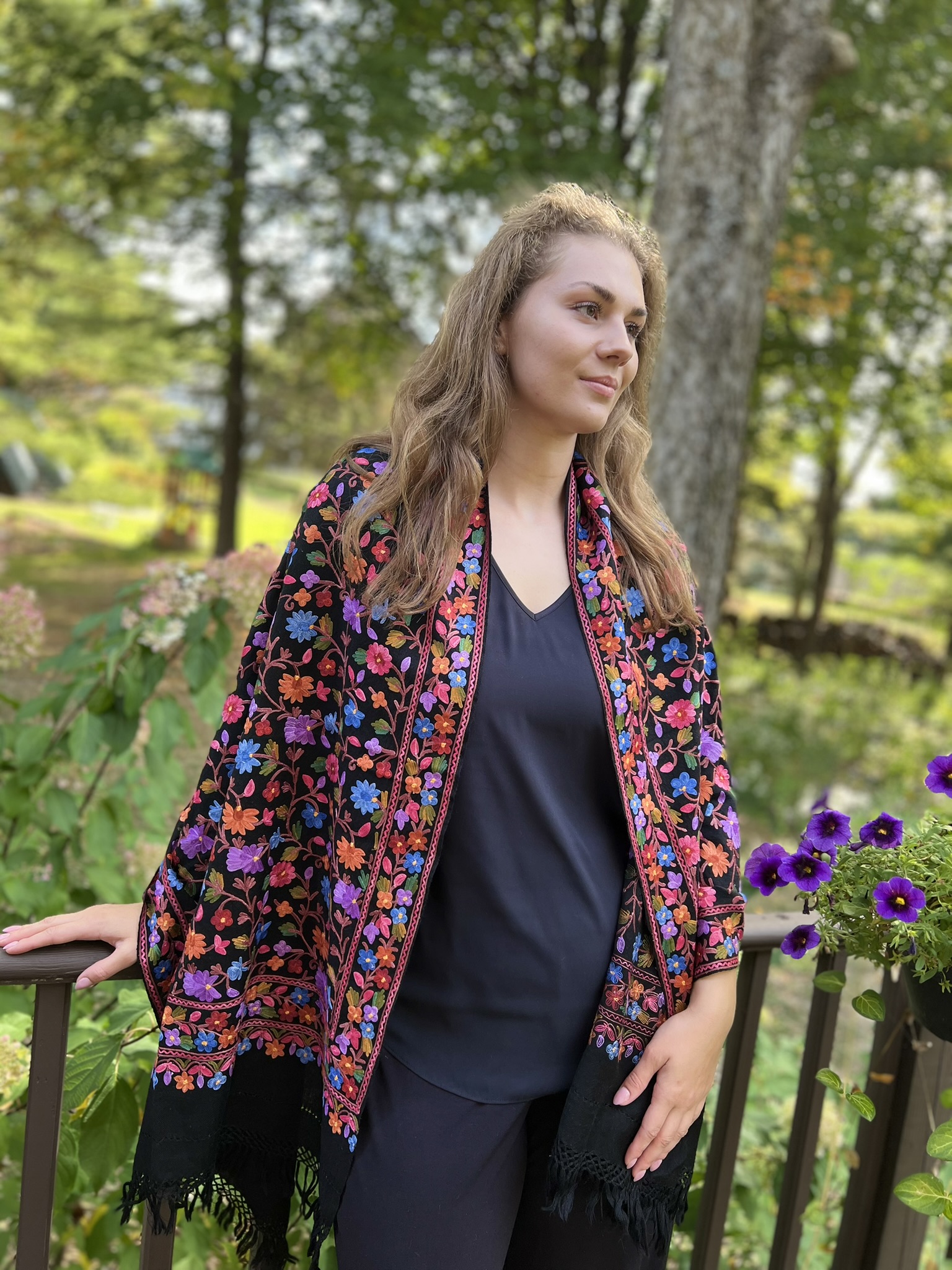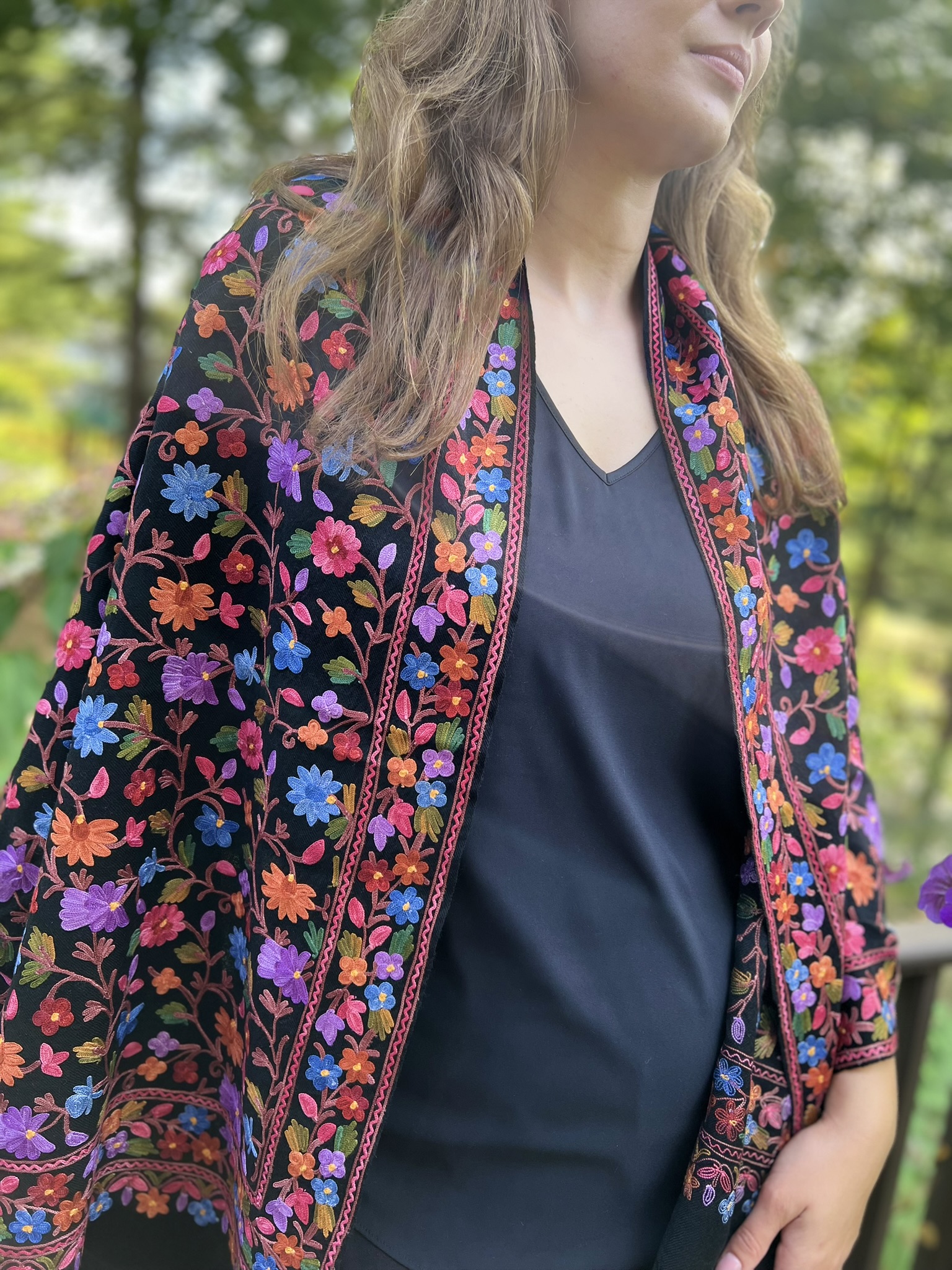 Crafted for both elegance and comfort, this masterpiece is meticulously embroidered in a vibrant, multicolor palette. The intricate motifs are brought to life on a base of fine, power-loomed wool, giving you the coveted lustrous sheen and delightful warmth of a luxury wrap without the pashmina price tag.