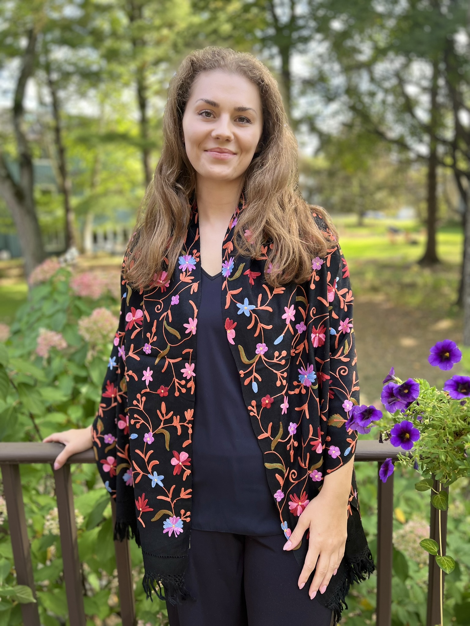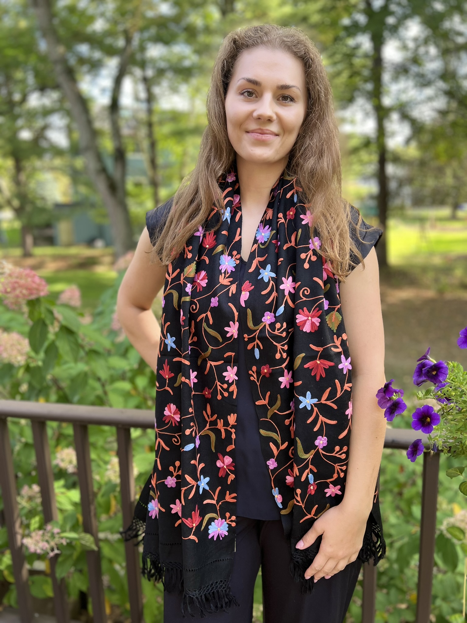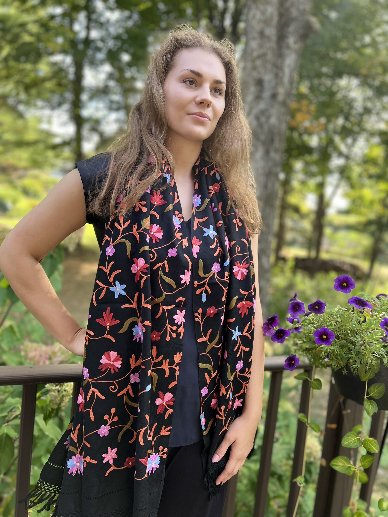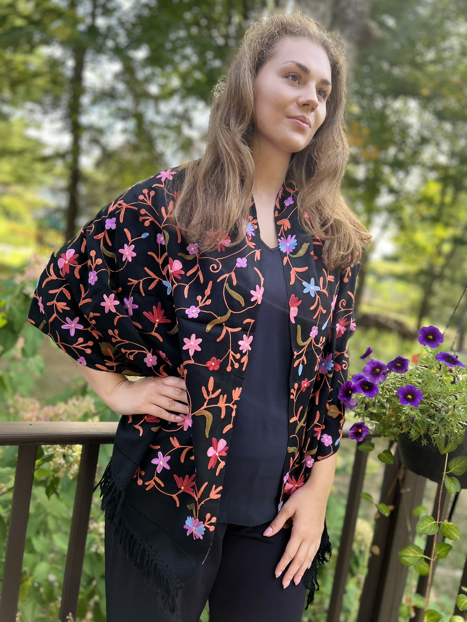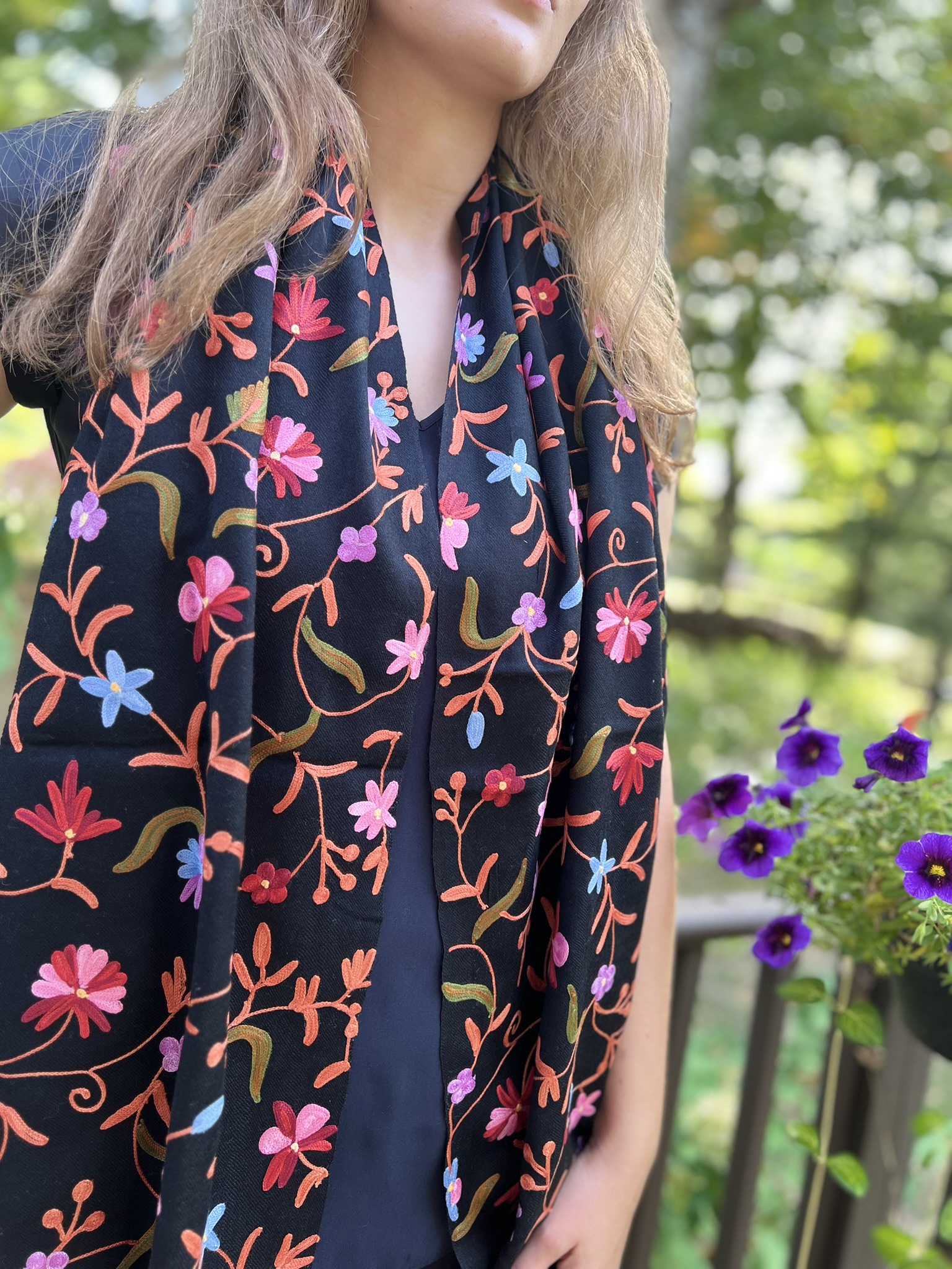 Crafted for both elegance and comfort, this masterpiece is meticulously embroidered in a vibrant, multicolor palette. The intricate motifs are brought to life on a base of fine, power-loomed wool, giving you the coveted lustrous sheen and delightful warmth of a luxury wrap without the pashmina price tag.