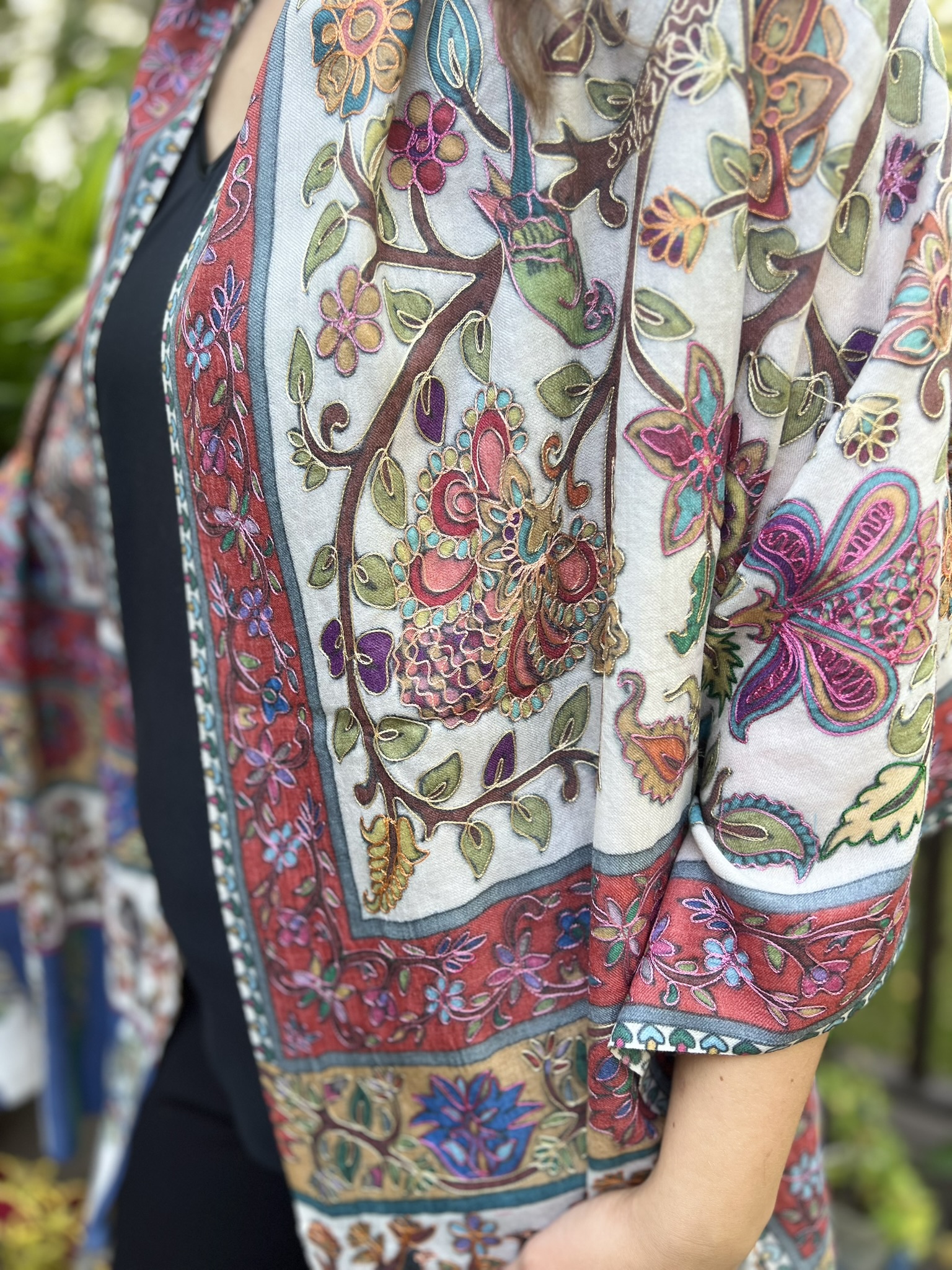 Care Instructions: To preserve its beauty, we recommend dry cleaning or gentle hand washing in cold water with a mild detergent. Always air dry away from direct sunlight and iron on a low setting on the reverse side to protect the exquisite artwork.