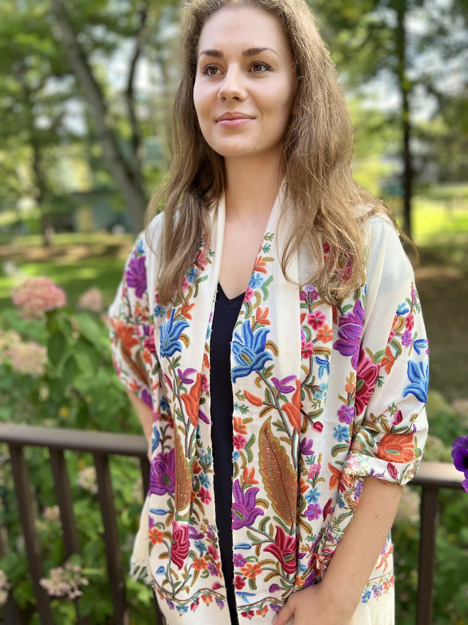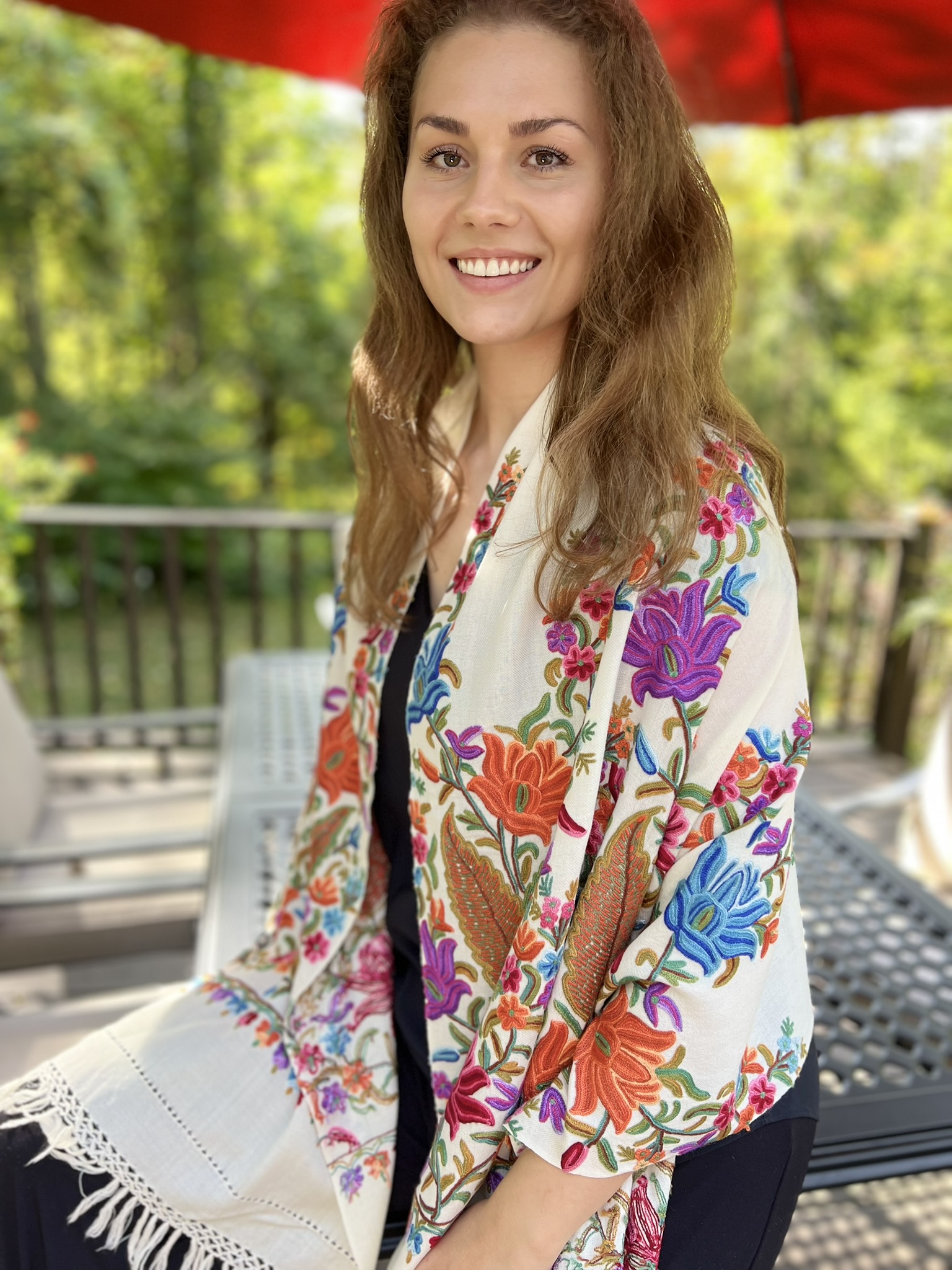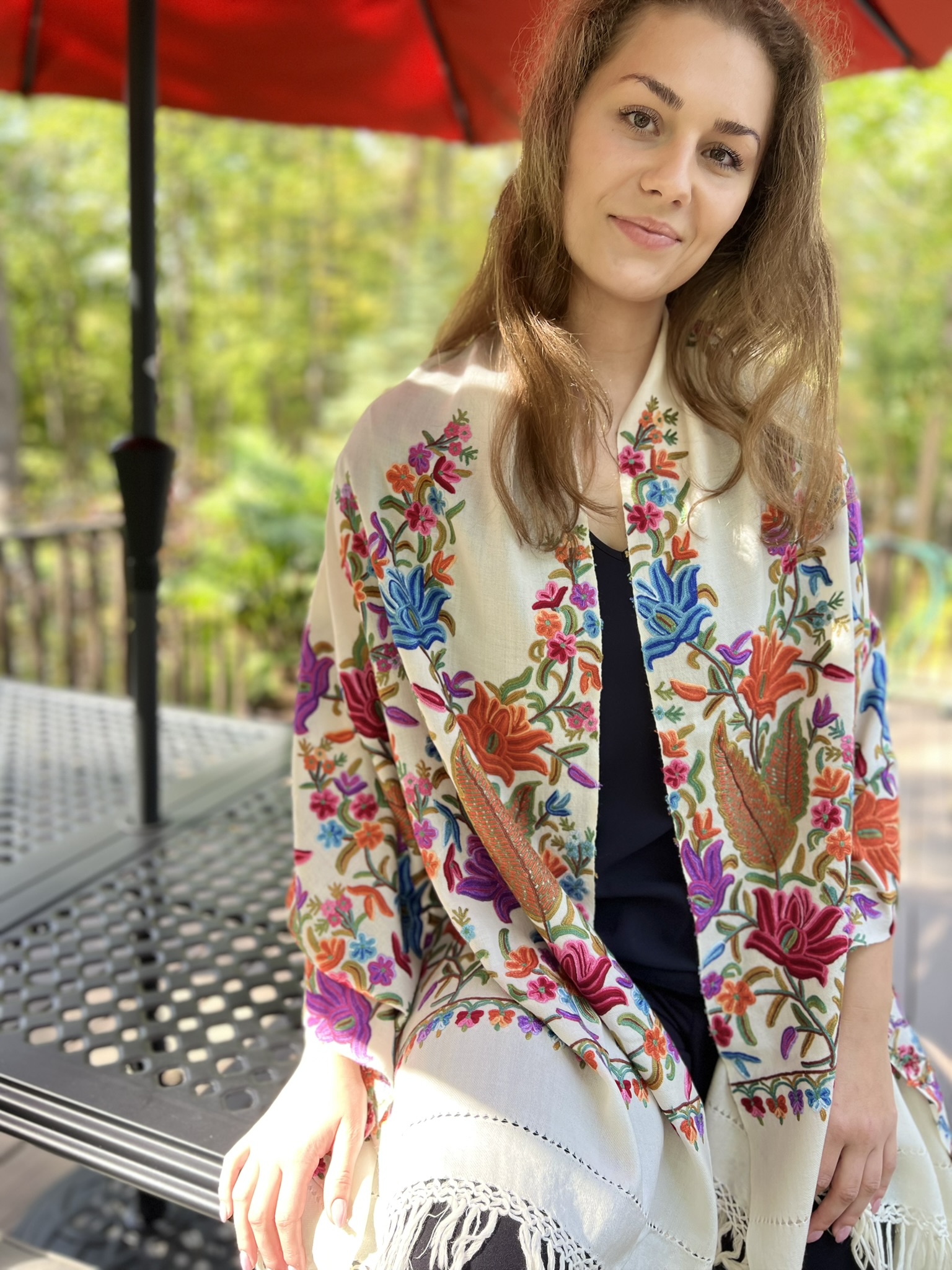 Hand embroidered custom-designed wrap/stole. This shawl has been meticulously embroidered with hand by skilled craftsmen and women. Beautiful flower design in gorgeous colors on fine wool. The edges are intricately fringed adding to the charm.