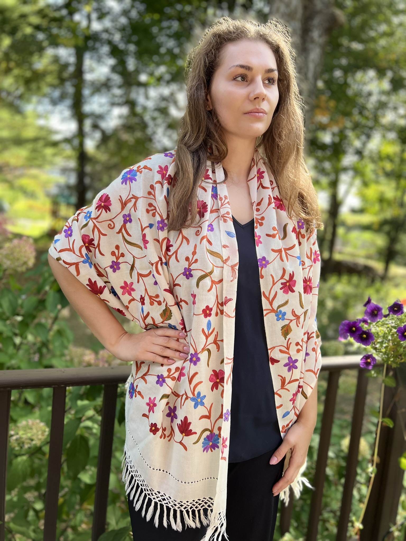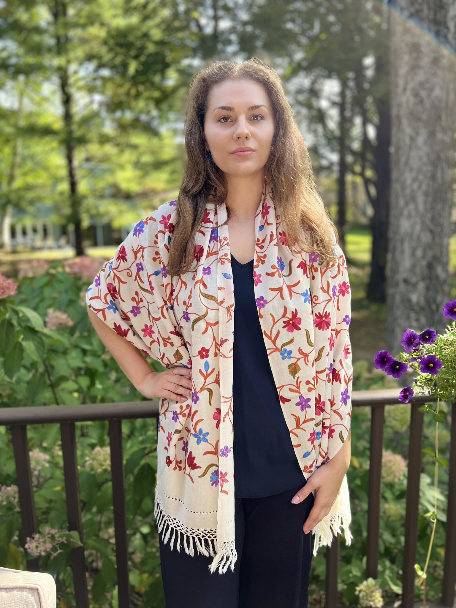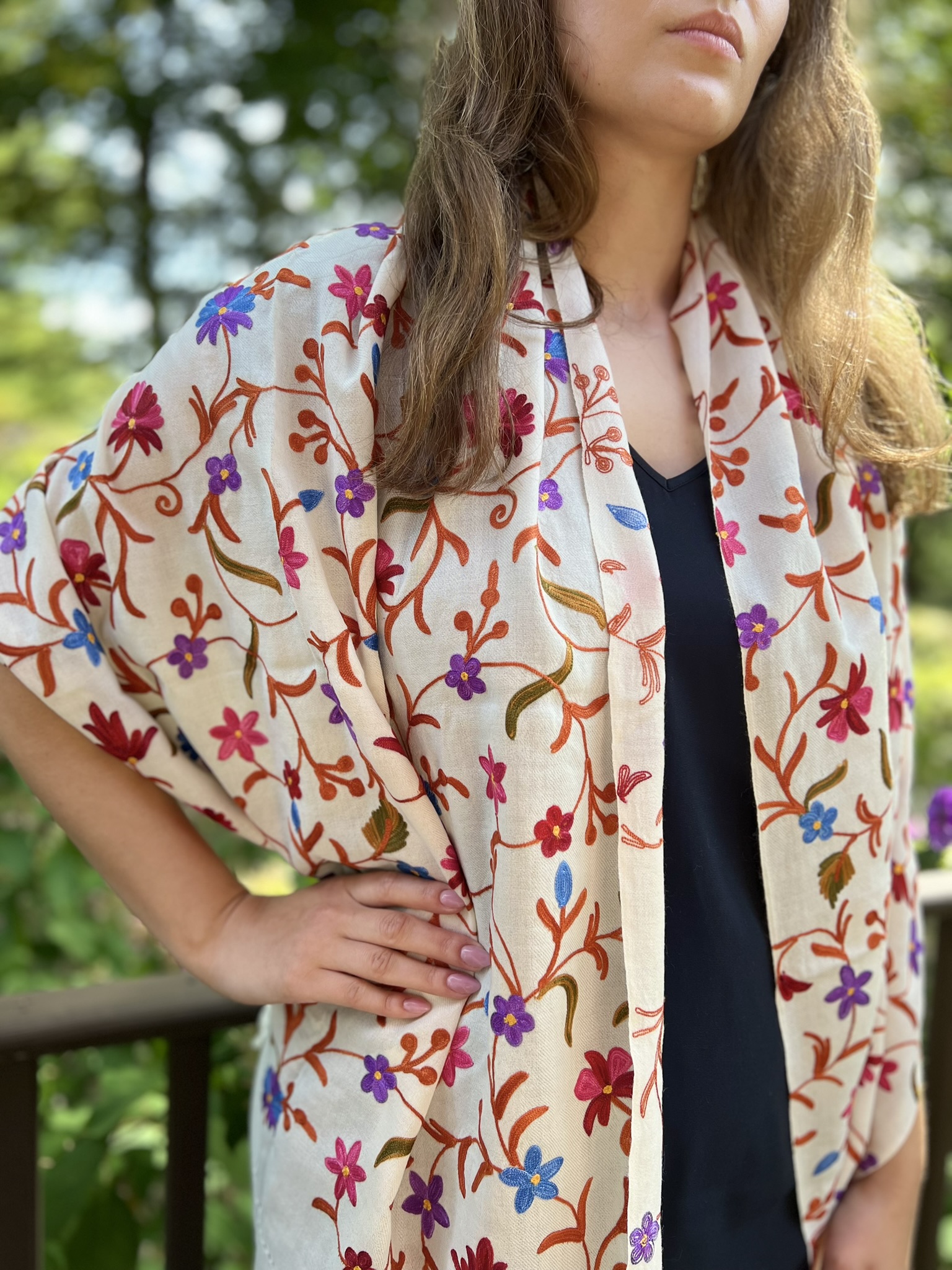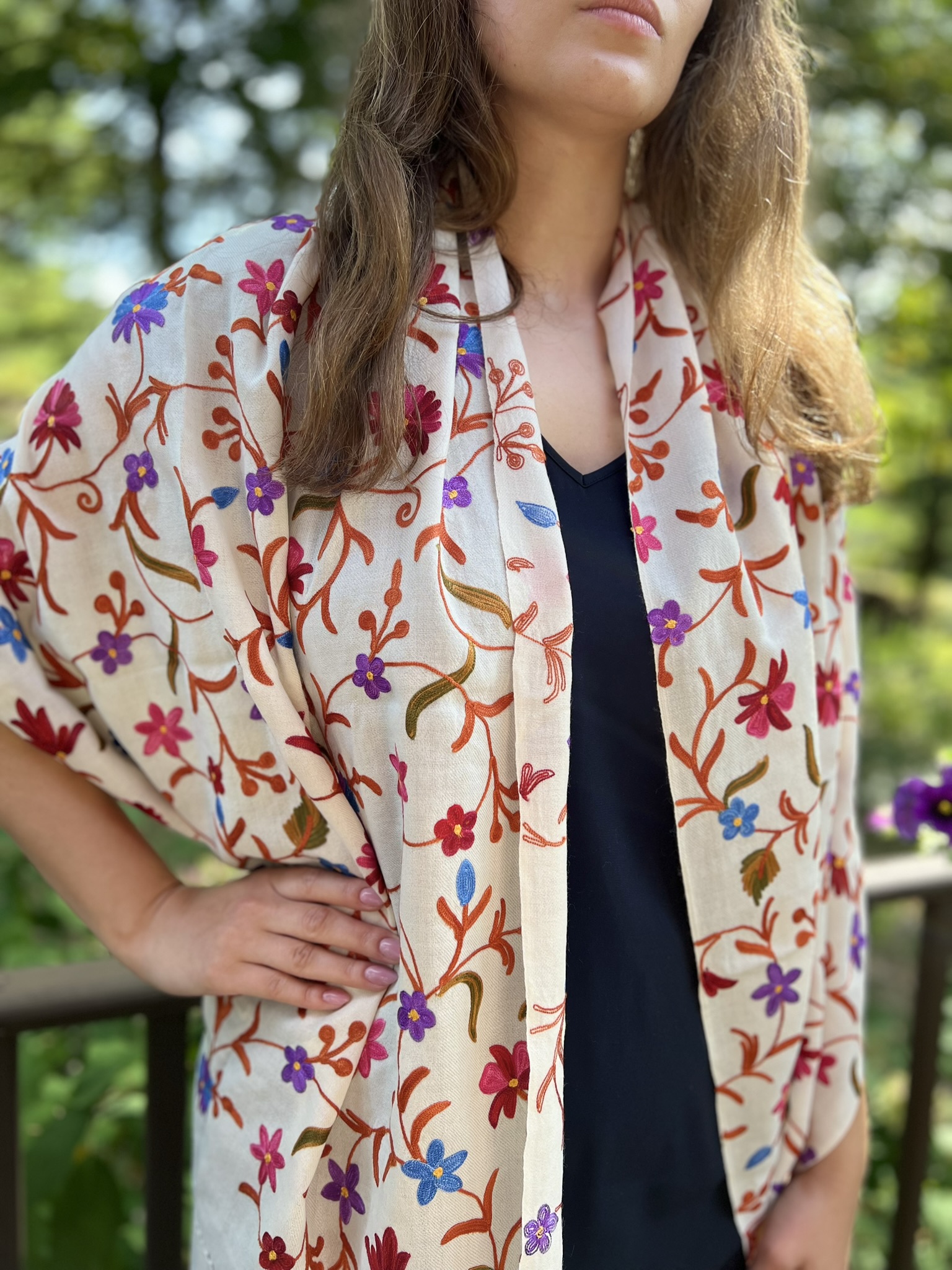 Crafted for both elegance and comfort, this masterpiece is meticulously embroidered in a vibrant, multicolor palette. The intricate motifs are brought to life on a base of fine, power-loomed wool, giving you the coveted lustrous sheen and delightful warmth of a luxury wrap without the pashmina price tag.